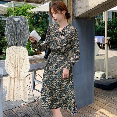 플라워 패턴 롱 원피스 봄가을 긴팔 잔잔한 꽃무늬 드레스 WFLLQXI