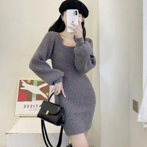 스퀘어넥 봄 가을 여성용 짧은 니트 미니 원피스 데이트룩 WFLLQQB