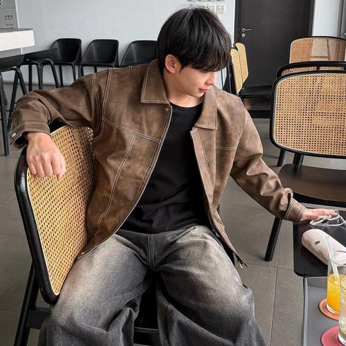남성용 가죽 재킷 레드브라운 빈티지 워싱 레더 카디건 레트로 블루종