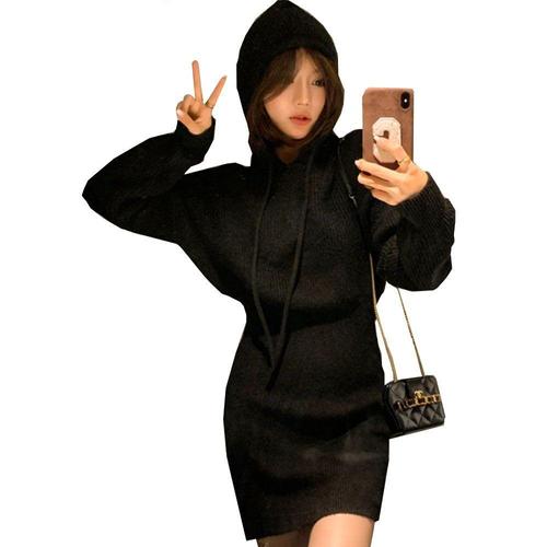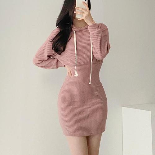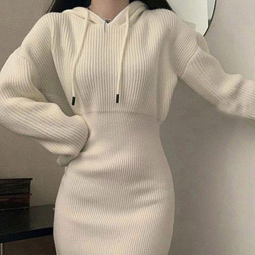 트렌디한 골지 니트 후드 슬림핏 드레스 (드로스트링 포함) - 여성용 편안한 캐주얼 스타일