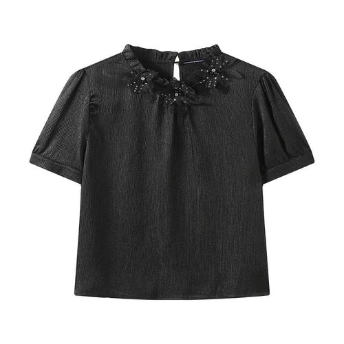 [미니멈 에브리데이]글로시 플라워 코사지 페미닌 반팔 블라우스 (EC2BA018D)