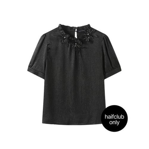 오드 BLO116 글로시 반하이넥 캡소매 블라우스