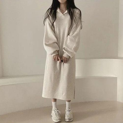 [미라클세븐]여성용 볼륨감 있는 기모 롱원피스 사이드 슬릿 박시핏 겨울용
