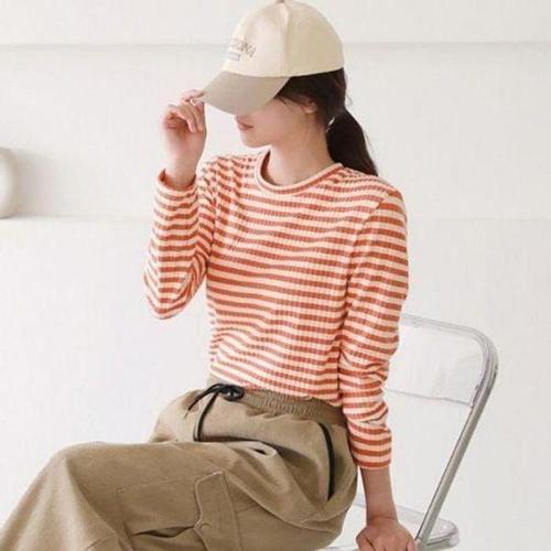 [셀러허브_여성트랜드패션]여성 롱슬리브 라운드 기모 티셔츠 긴팔 스트라이프