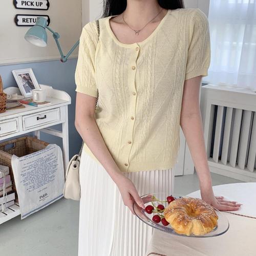 [옷자락] 여자 라운드넥 골드버튼 꽈베기 소프트 반팔 니트 가디건