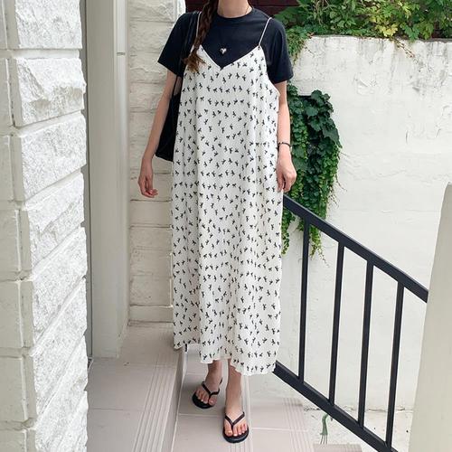 [옷자락]여자 리치 리본패턴 끈나시 플레어 롱원피스