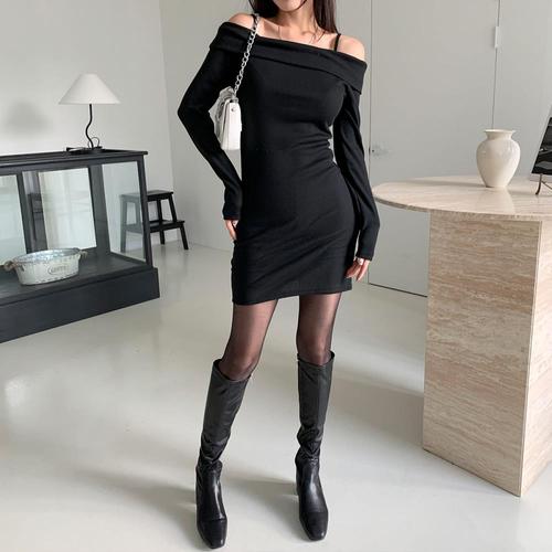 [옷자락] 여자 끈 오프숄더 슬림 골지 원피스