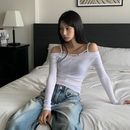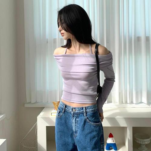 [옷자락]여자 베이직 끈 오프숄더 티셔츠