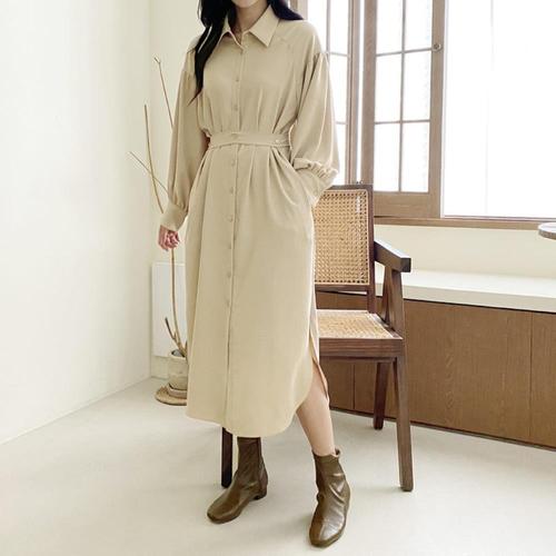 [옷자락] [시즌오프]셔츠핏 라글란 허리벨트 부드러운 긴팔 롱원피스_5
