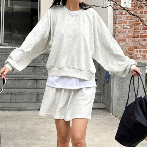 [옷자락] 여자 와플 나그랑 퍼프 맨투맨 밴딩 반바지 츄리닝 세트