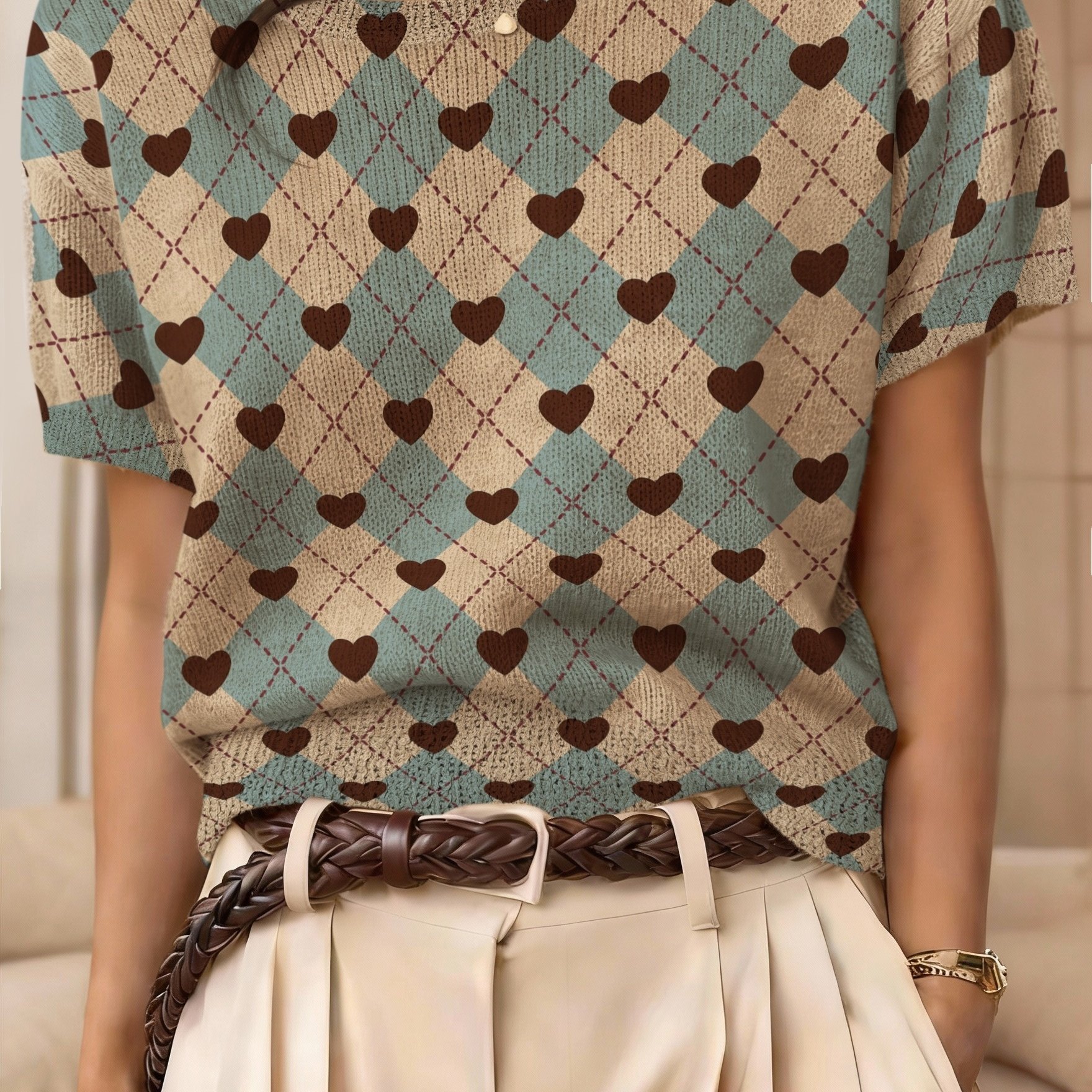TEMU [얇은 스웨터] 발렌타인데이 분위기, 패션 여성용 라이트 블루 체크 , 스위트 프레피 스타일 반팔, 나이감 감소 하트 프린트 디자인, 데일리 출퇴근 및 캐주얼 외출에 적합, 편안한 원단, 레귤러 핏