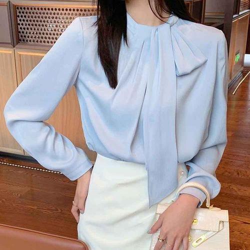 [에이치플러스몰]새틴 블라우스 라운드넥 타이포인트 핀턱 오피스룩