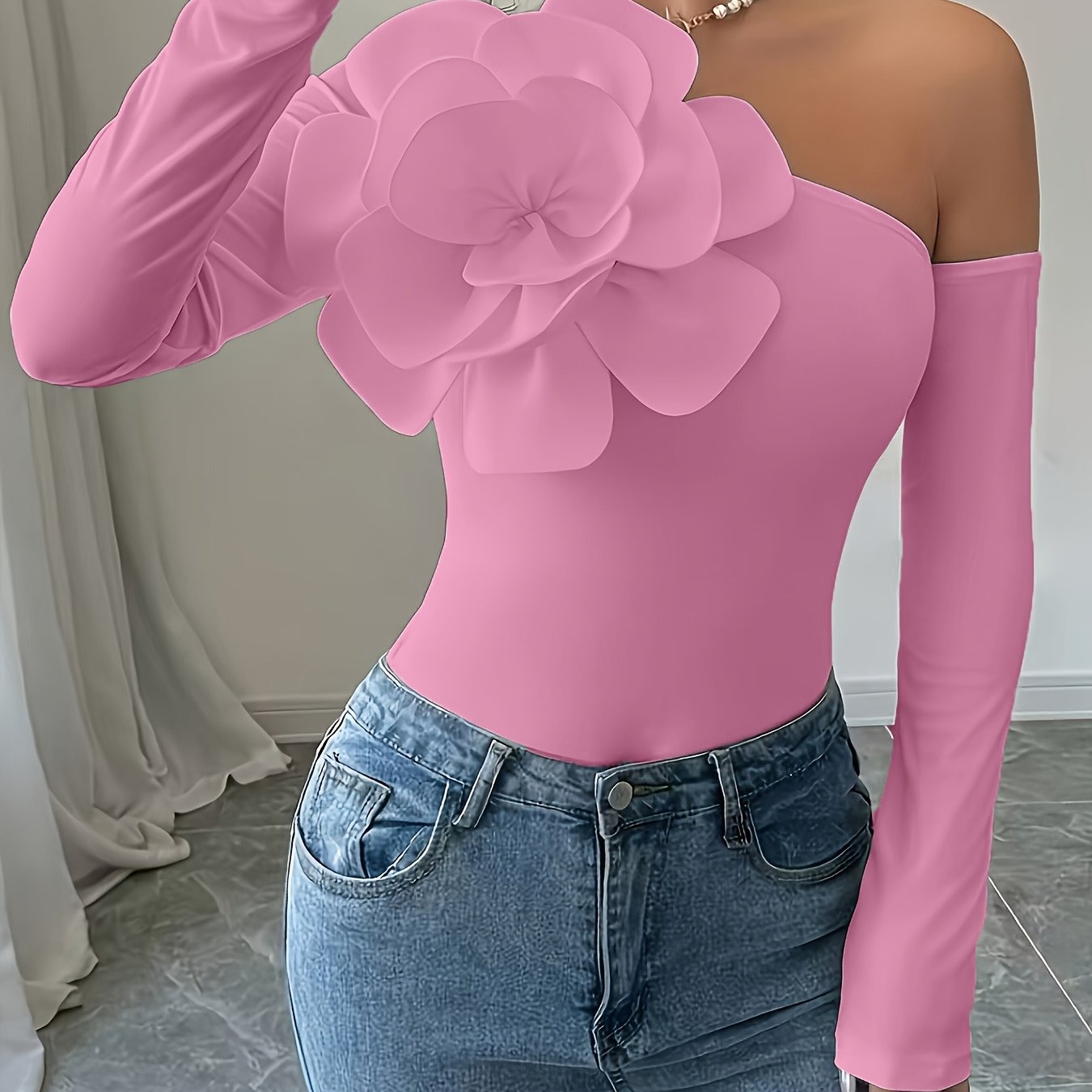 TEMU 플로럴 슬란트 칼라 슬림 롱 슬리브 캐주얼 탑