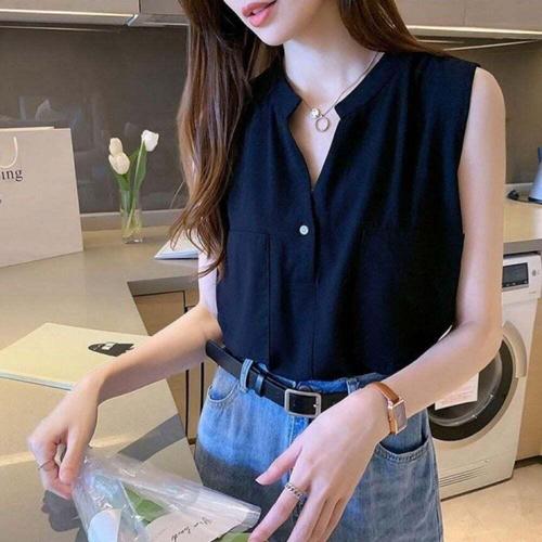 [오너클랜]인기상품 여성용 노카라 셔츠 오피스 캐주얼 2컬러 슬리브리스 블라우스 [WFLLOBU_260305]