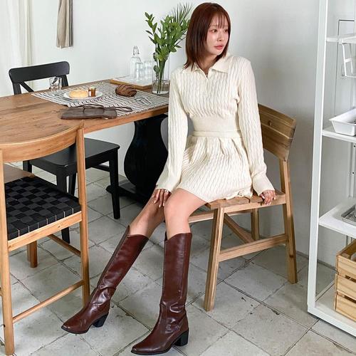 [옷자락] 여자 카라넥 꽈배기 크롭 니트 스커트 세트