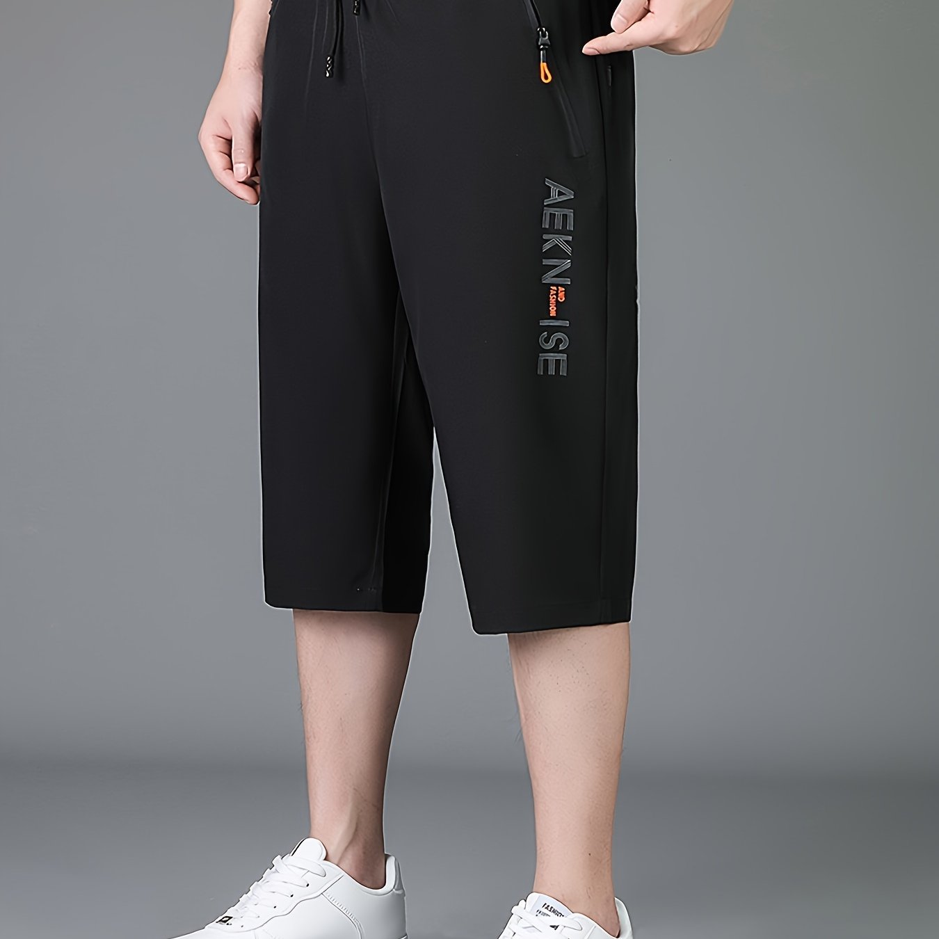 TEMU 남성 캐주얼 스포츠 카프리스 - 통기성 좋은 속건성 디자인, 지퍼 포켓, 드로스트링 허리 밴드, 레터 프린트, 야외 활동 및 데일리룩에 적합