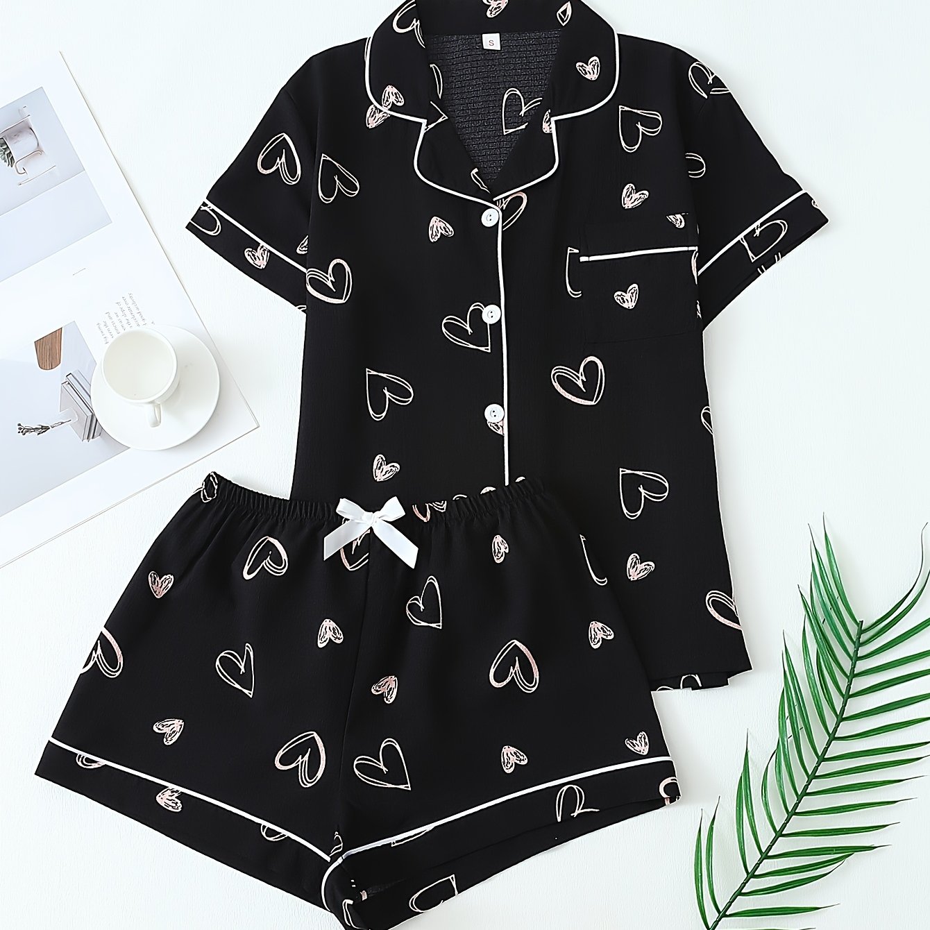 TEMU 봄/여름용 블랙 바닥 러브 프린트 패션 세트, 턴 칼라 버튼 탑과 리본 쇼츠 파자마 슈트