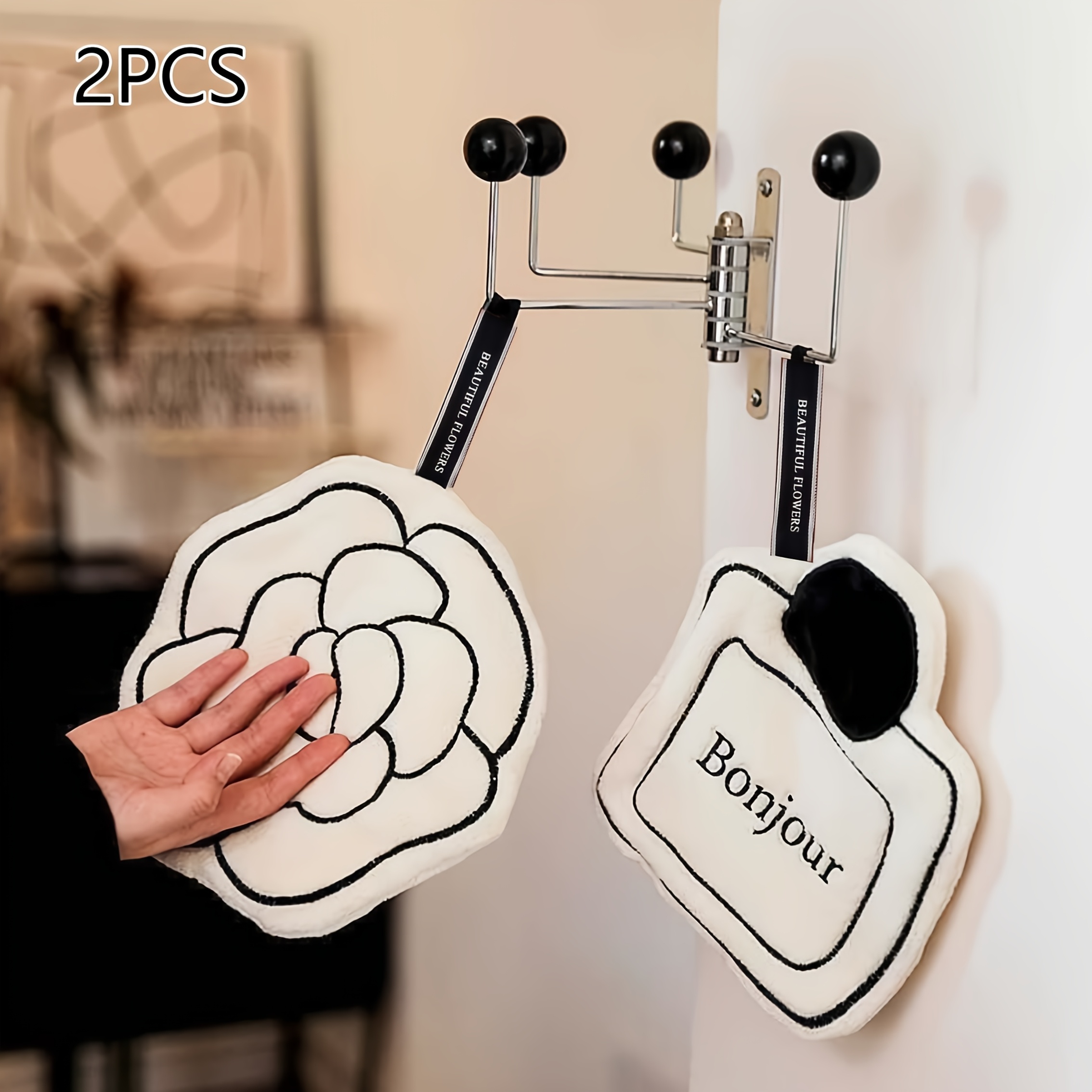TEMU 프랑스 카멜리아 패턴 욕실 핸드 타월 2개 세트 - 초흡수성 코랄 플리스 극세사, 걸이 루프 손가락 타월 포함, 프랑스어 'Bonjour'와 카멜리아 디자인, 모던한 집에 완벽