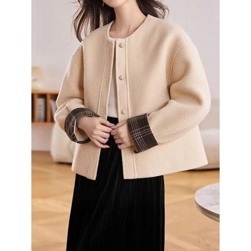 네모엔룩 부클레양털 여성용 인조 뽀글이 플리스 덤블 콘트라스트 배색라인 안감스웨이드 노카라 라운드넥 퍼 자켓