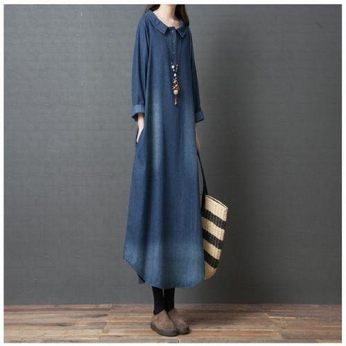 POMTOR 여자 가을 데님 원피스 셔츠 롱 원피스
