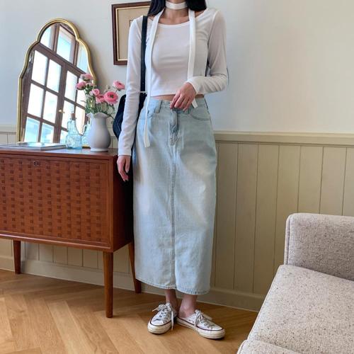 [옷자락]여자 베이직 워싱 뒷트임 일자 데님 롱스커트