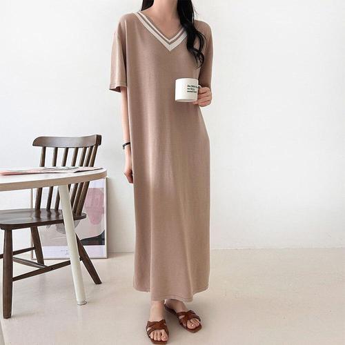 [문에이블]문에이블 여자 여성 여름 루즈핏 데일리룩 배색 브이넥 니트 비스코스 마실룩 반팔 롱 원피스
