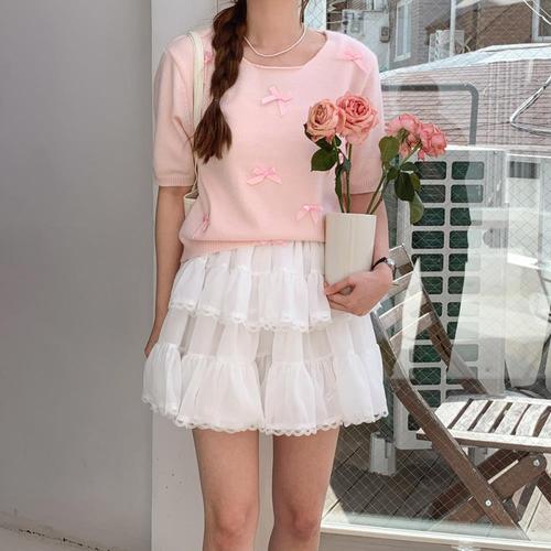 [다잇템]여자 리본 반소매 데일리 포인트 U넥 니트