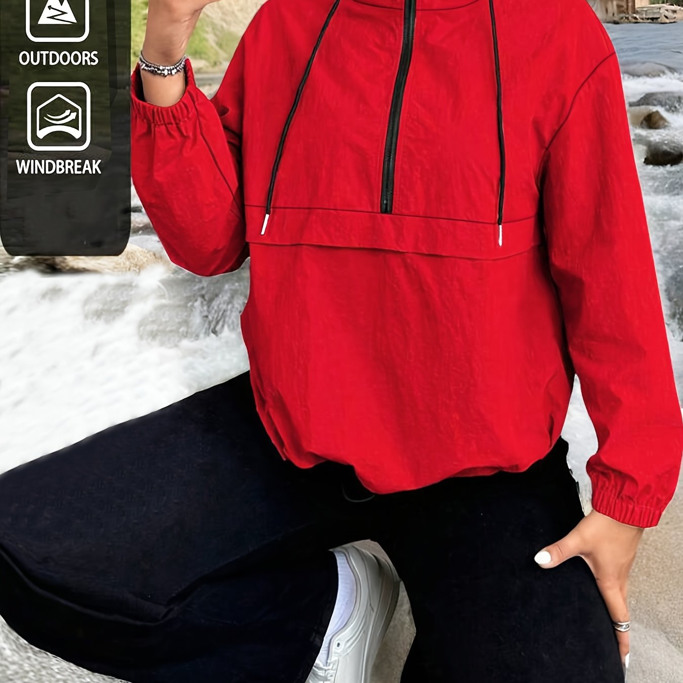 TEMU 패션 캐주얼 플러스 사이즈 여성 루즈핏 후드 드로스트링 집업 스웨트셔츠, 봄 여름 신상 스타일, 하프 오픈 지퍼 디테일, 단색, 데일리 홈웨어, 출퇴근, 편안하고 다재다능한 여성 플러스 사이즈 캐주얼 봄 여름 의류