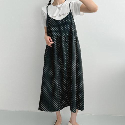 [옷자락] 여자 백리스 빅사이즈 임부복 도트 끈나시 롱원피스