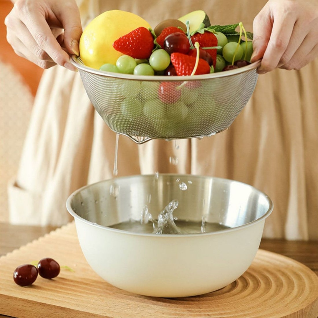 크림 스텐 믹싱볼 채반 3종세트 계량 눈금 베이킹반죽 쌀세척 야채 재료손질 샐러드 보울