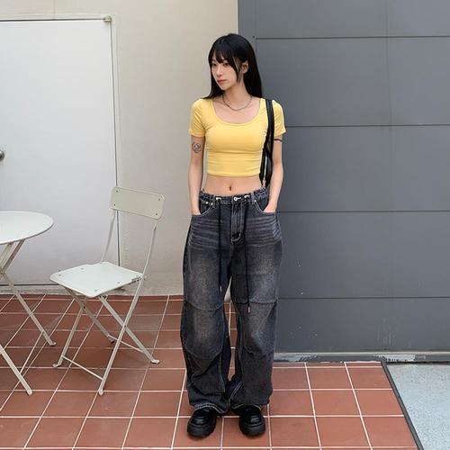 [옷자락]여자 유넥 잔골 백 랩 포인트 크롭 반팔티
