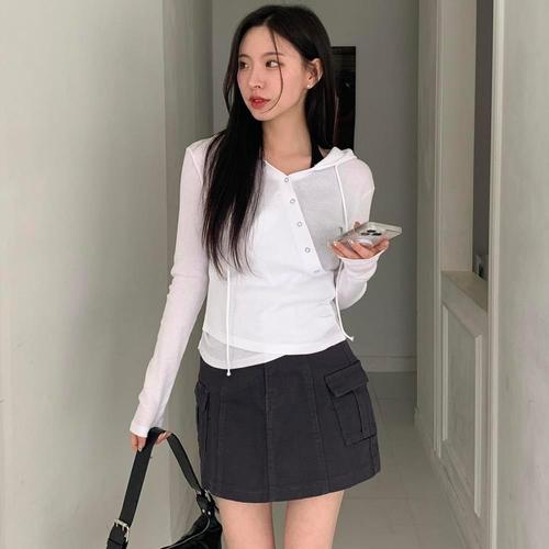 [다잇템]여자 랩 골지 단추 잔주름 슬림 후드티