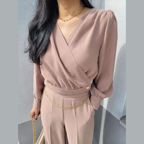 랩스타일 V넥 블라우스 롱 팬츠 셋업 (GQBOW003D)