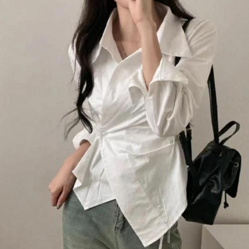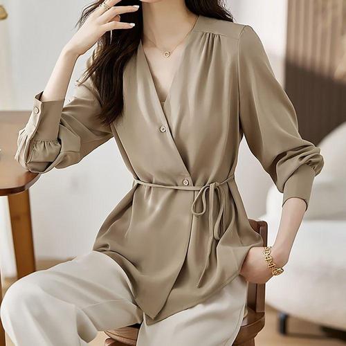 여성용 허리 스트랩 랩 디자인 긴팔 블라우스 볼륨감 있는 상의 WFLLNEX