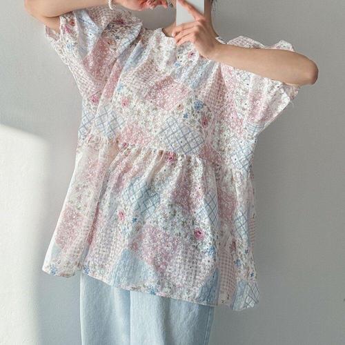 [옷자락]여자 플라워 패치워크 배색 러블리 퍼프 블라우스