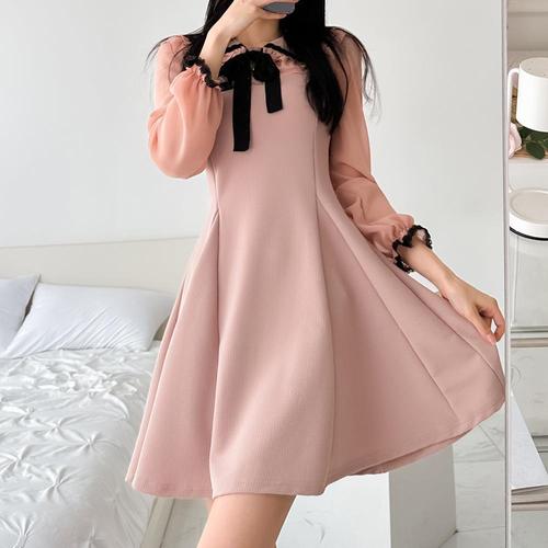[옷자락] [시즌오프]레이스 프릴 리본 카라 페미닌 미니 플레어 원피스_5