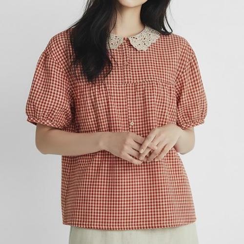 [유니제이] 컨트 레이스카라 체크 반팔 블라우스