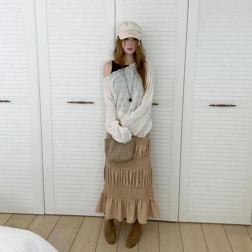 [옷자락]여자 로맨틱 페미닌 데이트룩 데일리 밴딩 셔링 캉캉 롱스커트