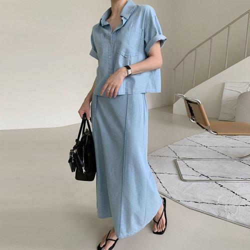 [유야]데님 셔츠 롱 스커트 세트 청남방 투피스 -SST0112H- 여성 여름
