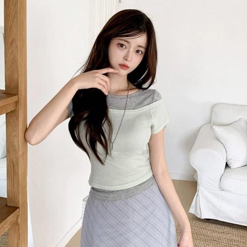 [옷자락]여자 슬림핏 배색 반팔 롱스커트 투피스