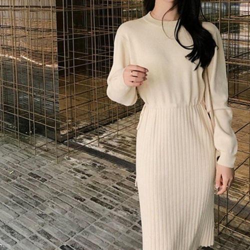 가을 겨울용 루즈핏 라운드넥 롱 울 니트 드레스 WFLLQRF