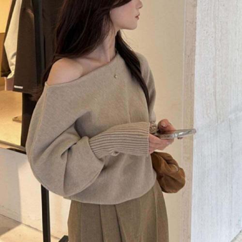 [오너클랜]인기상품 입술넥 크롭 니트 심플 긴팔 데일리 보트넥 여성 루즈핏 [WFLPUO1_260420]