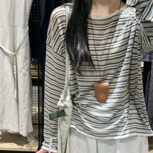 여성 루즈핏 민트 스트라이프 라운드넥 롱 슬리브 WFLLQYU