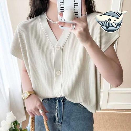 [옷자락]여성 린넨 반팔 브이넥 가디건 여름 니트 버튼 가디건