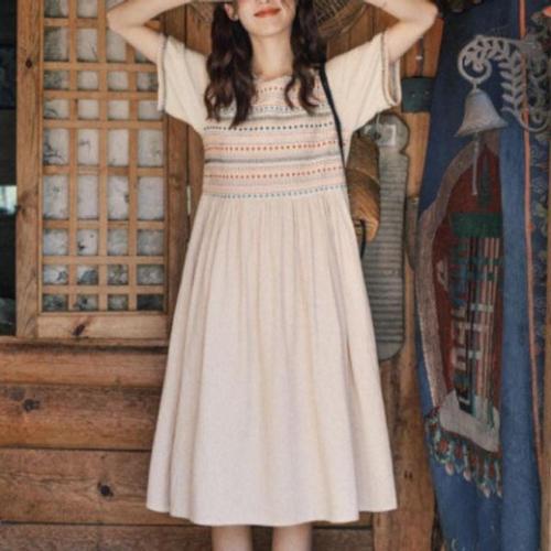 자수 원피스 루즈핏 롱 린넨 에스닉 플레어 휴양지 여 WFLLNW2