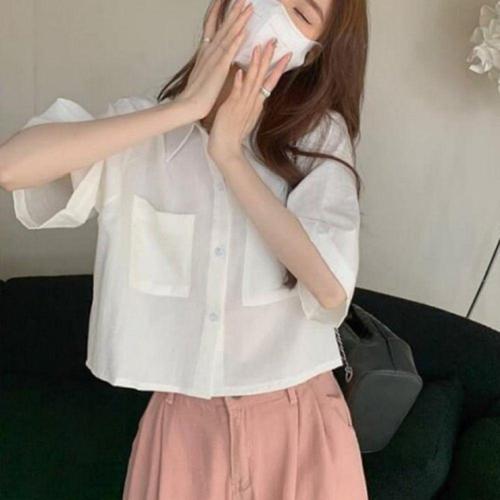 여성용 여름 린넨 크롭 카라 셔츠 반팔 루즈핏 데일리 블라우스 WFLLNDW