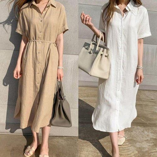 린넨 여성 반팔 셔츠형 롱 원피스 여름용 단품 WFLLR4D