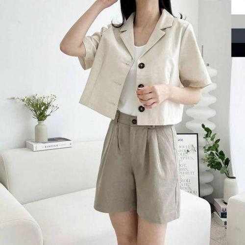 [옷자락]여자 베이직 세미크롭 린넨 반팔 셔츠 허리밴딩 플리츠 반바지 세트