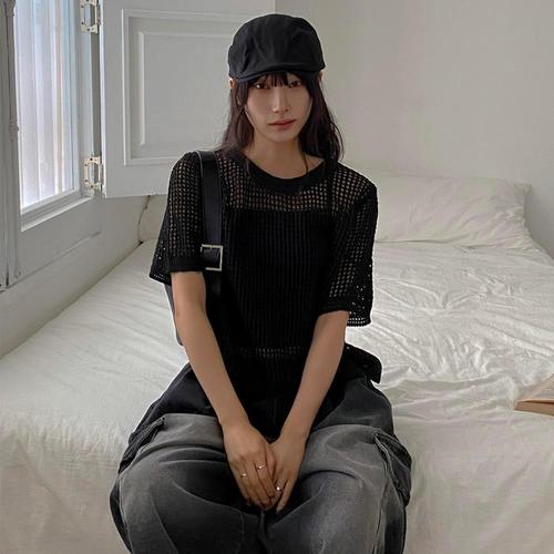 여성 여름 시스루 상의 반팔 망사 루즈핏 니트 그물 V넥 [mFEEE8B]