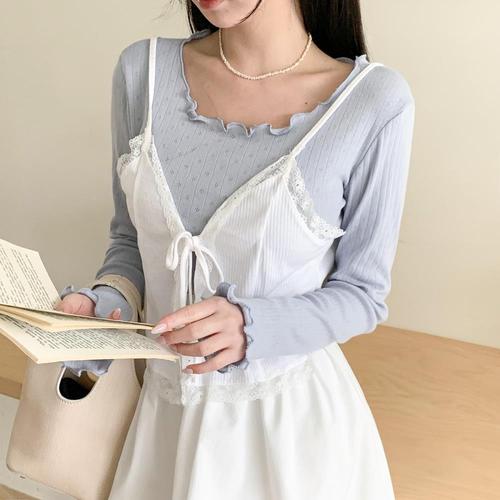 [옷자락]여성 머랭 펀칭 물결 넥 기본 긴팔 티셔츠